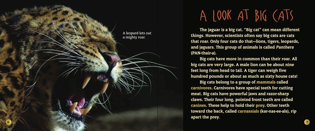 Lions, tigers, leopards, and jaguars are all big cats, and you would not like to meet them in the dark. They rest during the day but come to life at night to hunt. With a mighty roar, the big cats chase down their prey. Sharp teeth and claws and powerful jaws mean certain doom. Author Elaine Landau tells the reader all about these beautiful hunters: how they hunt, where they live, and what the future holds for the big cats.