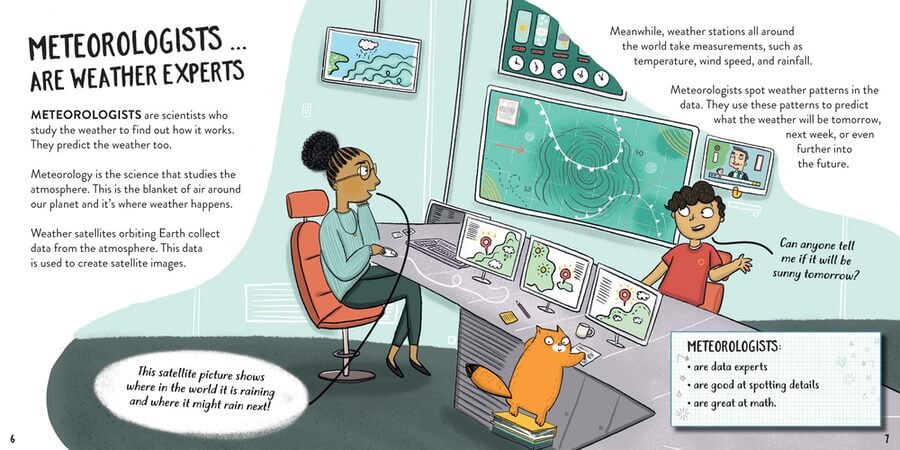 Studying weather is more than just predicting storms and guessing the temperature for the coming week! Some scientists, like storm chasers, are collecting valuable data about intense weather patterns like tornadoes or hurricanes. Others, like climatologists, study different climates around the world and how they are changing. In this book, readers explore some of the many careers relating to weather. With the help of Billie, Mia the cat, and their magic dress-up box, readers meet each professional and learn what it takes to do each job.